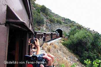 Ein besonderer Spass auf dem Pilion: Eine Fahrt in den historischen Zügen der Schmalspubahn! Baubeginn war 1881, fertiggestellt wurde die Strecke 1904. Zwischenzeitlich stillgelegt, verkehrt die Bahn nun wieder als Touristenattraktion in den Sommermonaten.